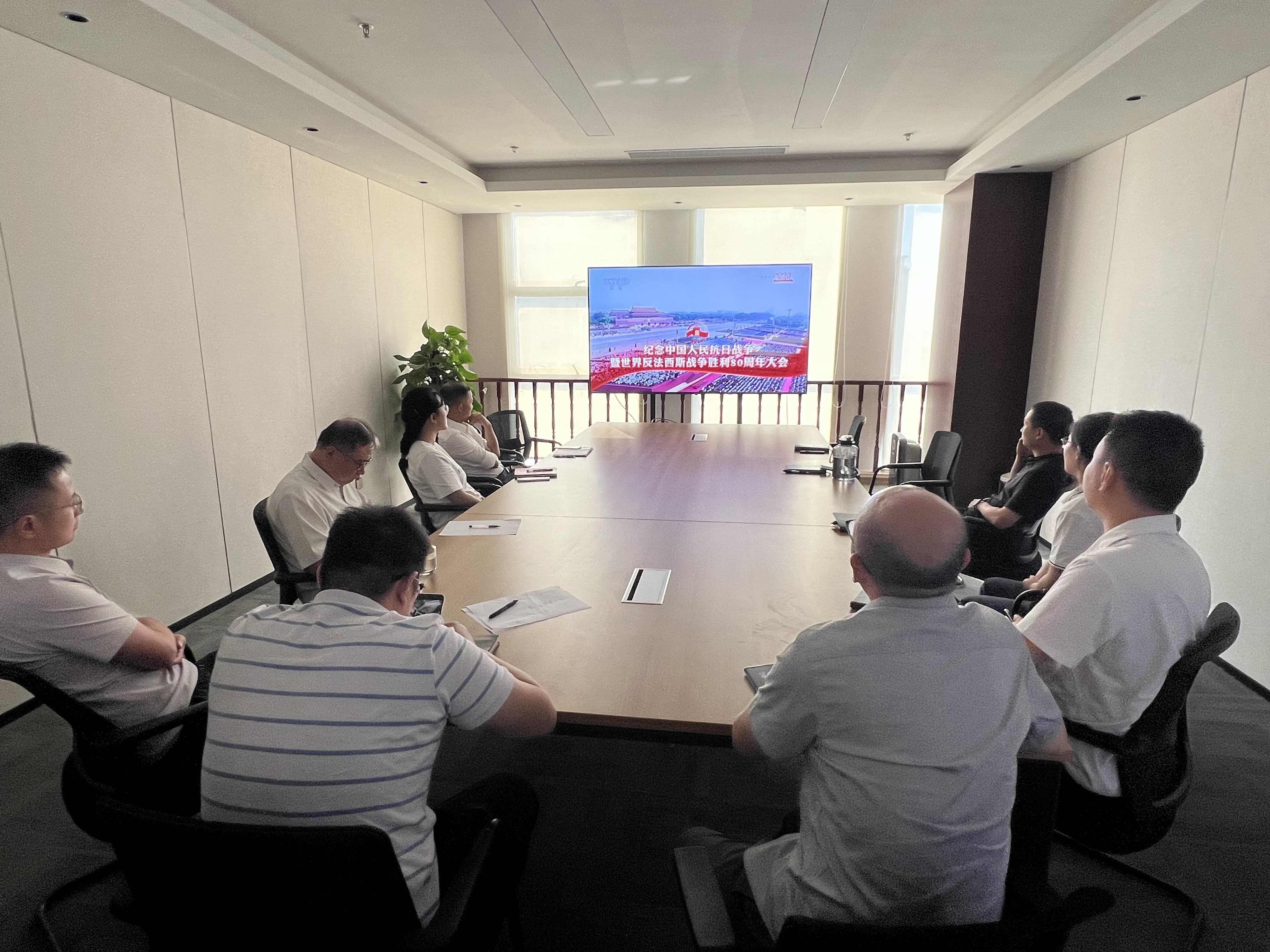數(shù)旅集團(tuán)組織集團(tuán)業(yè)務(wù)事業(yè)部、研發(fā)管理中心、紫荊公司在36樓會(huì)議室觀看“紀(jì)念中國(guó)人民抗日戰(zhàn)爭(zhēng)暨世界反法西斯戰(zhàn)爭(zhēng)勝利80周年大會(huì)”專題節(jié)目