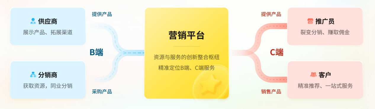 面對(duì)這些“散、亂、難”,行業(yè)開(kāi)始尋找答案:一張能連接一切的“智慧之網(wǎng)”。這張網(wǎng),要能整合分散的資源(B 端供應(yīng)商),打通多元的分銷(xiāo)渠道(B 端分銷(xiāo)商),更要能精準(zhǔn)觸達(dá)和服務(wù)最終消費(fèi)者(C 端),形成高效協(xié)同的生態(tài)。它不僅僅是工具,更是賦能運(yùn)營(yíng)、激活價(jià)值的底層操作系統(tǒng)。