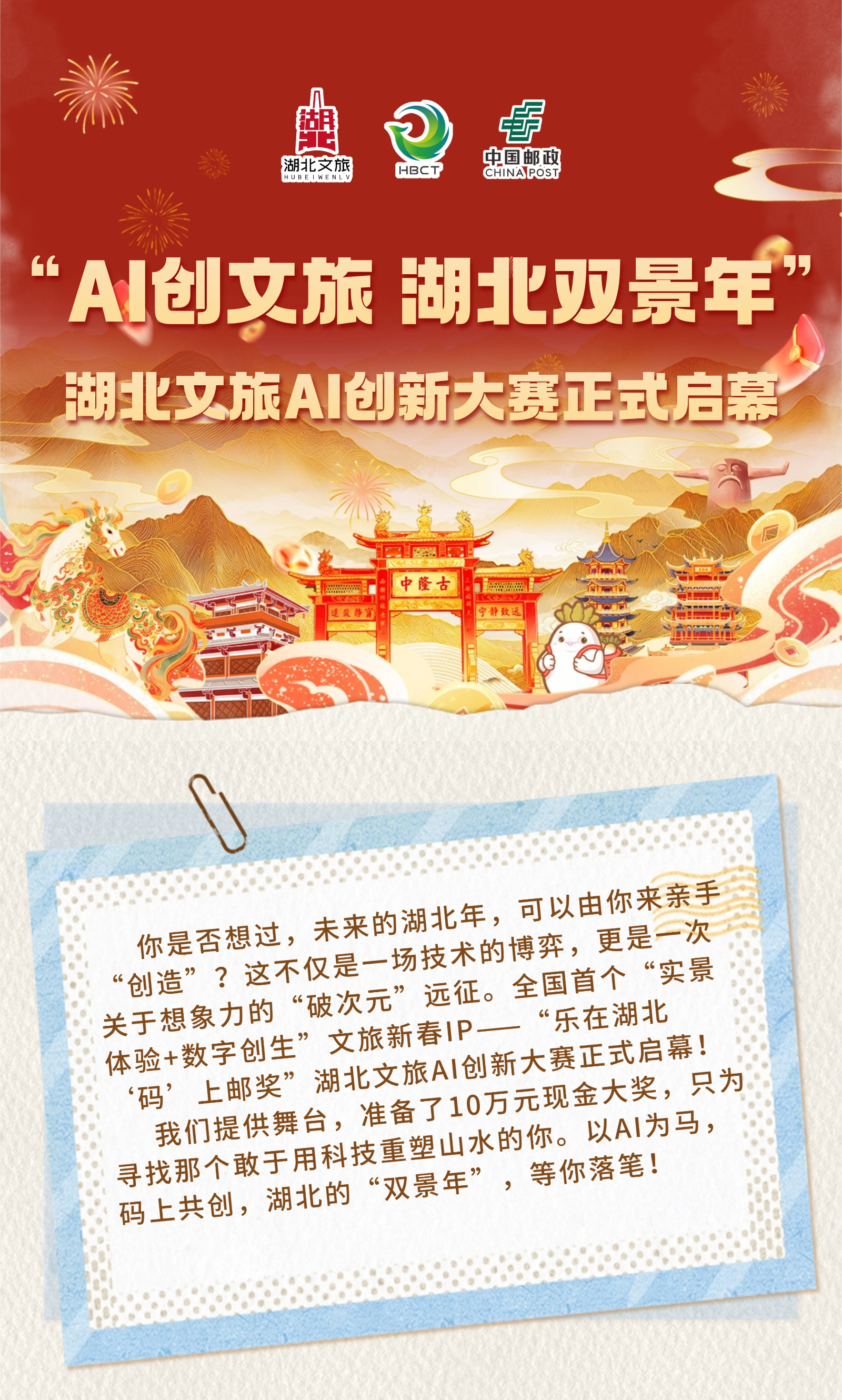穿梭荊楚,讓想象力先抵未來!“樂在湖北‘碼’上郵獎(jiǎng)”AI創(chuàng)新大賽正式啟幕。湖北文旅集團(tuán)聯(lián)合湖北省郵政公司、湖北美術(shù)學(xué)院,于2月4日正式啟動(dòng)“樂在湖北‘碼’上郵獎(jiǎng)”AI創(chuàng)新大賽。本次大賽以“AI創(chuàng)文旅”為核心,面向社會(huì)廣泛征集運(yùn)用AI技術(shù)創(chuàng)作的、融合湖北文旅特色的數(shù)字作品,旨在以科技激發(fā)創(chuàng)意,展現(xiàn)荊楚文化魅力。參賽者需運(yùn)用AI工具進(jìn)行創(chuàng)作,作品需創(chuàng)意獨(dú)特,并能將AI技術(shù)與湖北的文化旅游元素有機(jī)結(jié)合。大賽征稿截止時(shí)間為2026年4月30日,參與者可通過“游湖北”H5頁面進(jìn)行線上投稿。