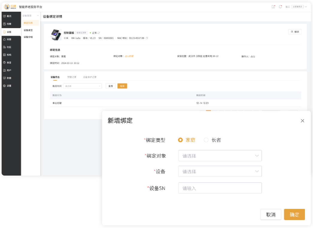 可實時采集設(shè)備連接狀態(tài)與運行狀態(tài)數(shù)據(jù)。無論是設(shè)備的在線/離線情況,還是運行中的各項參數(shù)指標,都能精準掌握。以便及時發(fā)現(xiàn)設(shè)備異常,快速定位問題,確保智能設(shè)備始終處于良好工作狀態(tài),為養(yǎng)老服務(wù)提供可靠支撐。