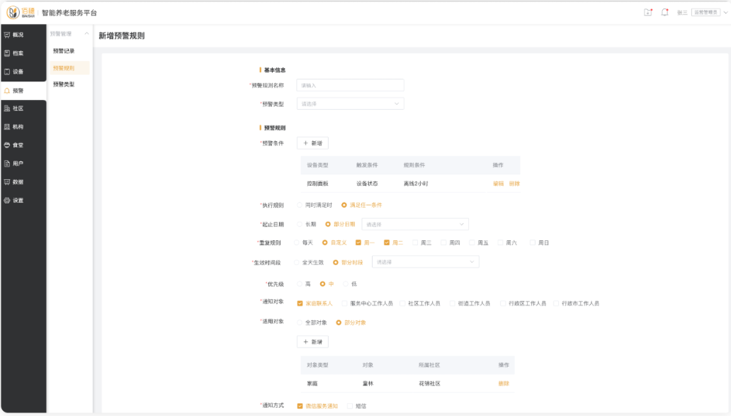 系統(tǒng)會即刻通過B端管理平臺、C端移動端小程序等多端平臺,向家屬及養(yǎng)老機構(gòu)工作人員同步發(fā)送警報信息,確保第一時間通知到位。以便相關(guān)人員迅速響應(yīng),為老人的安全與健康提供堅實可靠的保障。